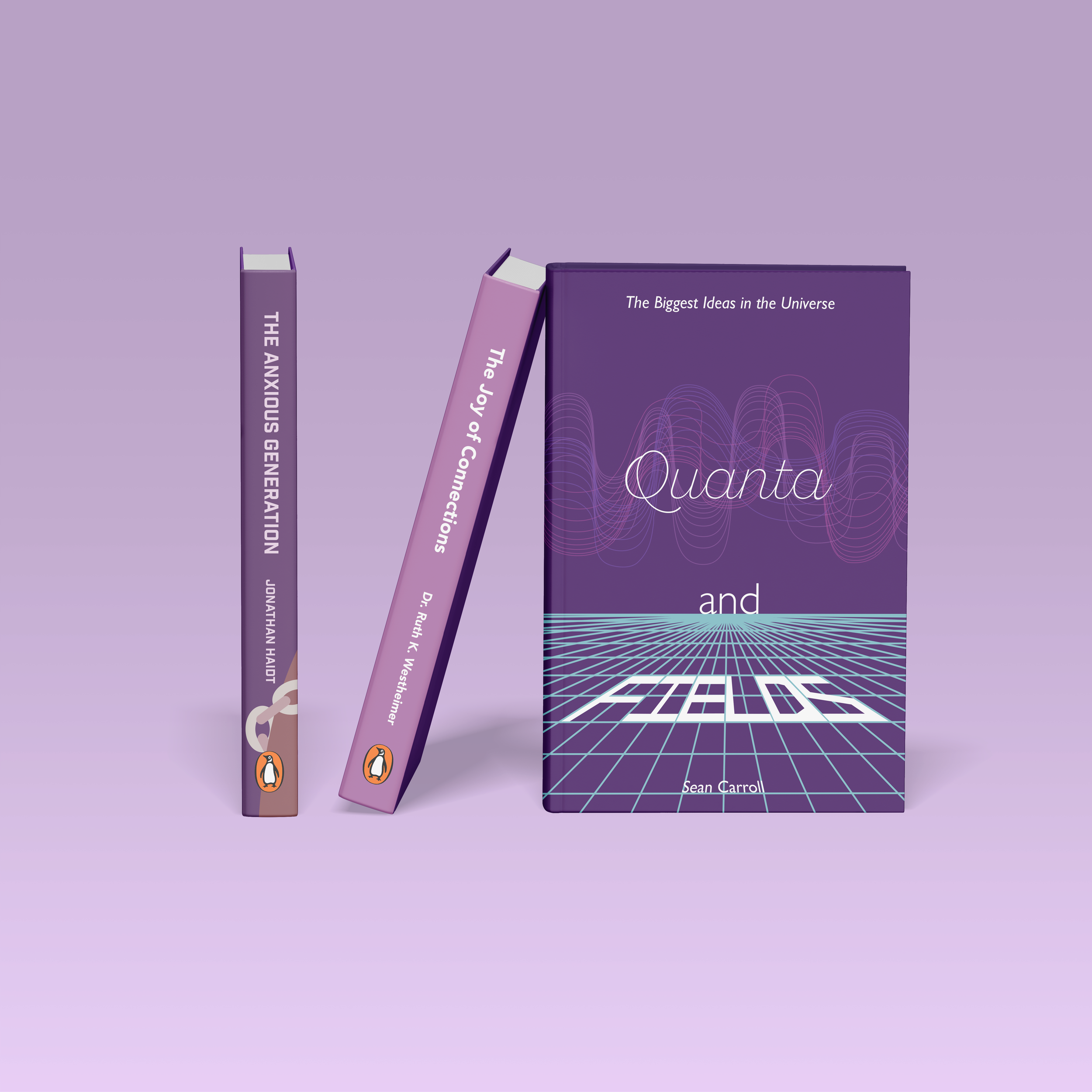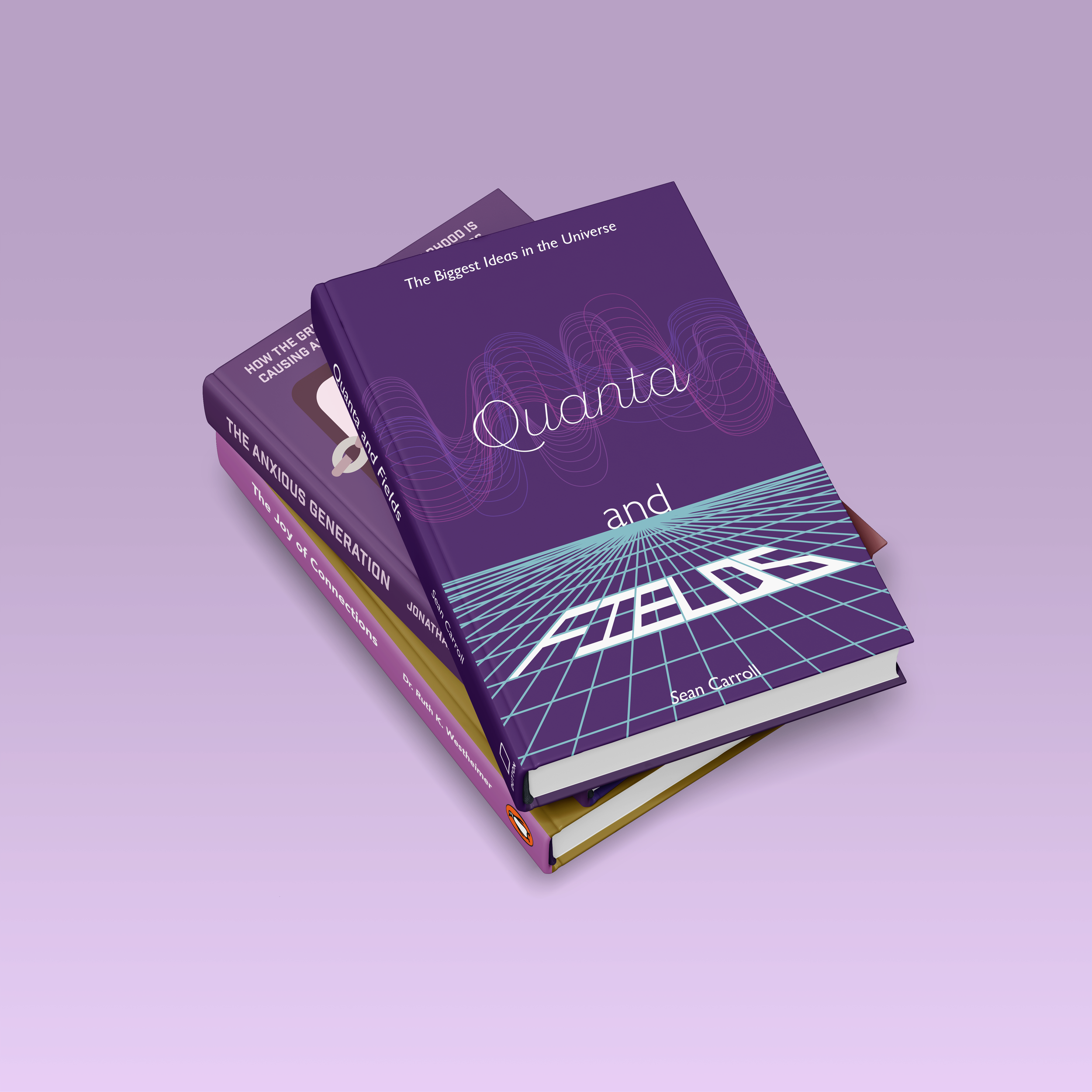 Recreation of covers for the books Quanta and Fields, The Anxious Generation, and The Joy of Connections.